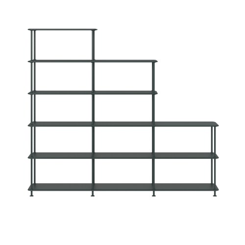 Deze opstelling van het Montana Free Shelving System is 3 elementen breed, op zijn hoogste punt 5 etages hoog en op zijn laagste punt 2 etages hoog. Een groot boekenrek met veel plaats èn met een elegante, minimalistische look.