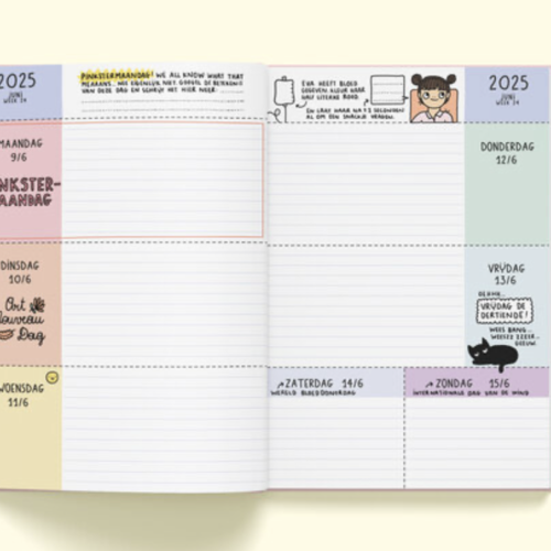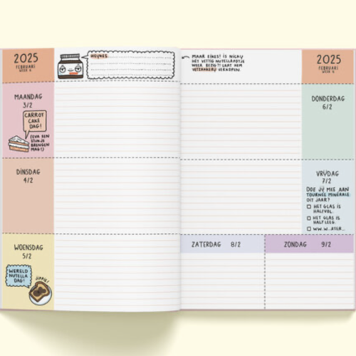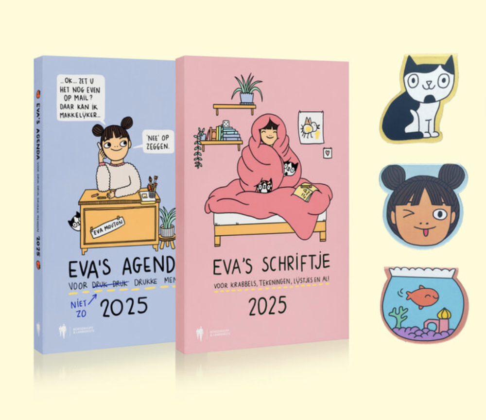 Hoera! Daar is de splinternieuwe agenda van Eva Mouton voor 2025. Met deze overzichtelijke agenda, boordevol leuke illustraties, wordt het zoveel leuker om de (werk)week te plannen. Uiteraard bevat de agenda nog steeds de gekste feestdagen, officiële vakantieperiodes, leuke invulpagina's en handige week- en maandoverzichten (voor 2025 én 2026). Voor wie graag extra schrijfruimte wil, zit er een schriftje bij de agenda. Dit jaar kan je je gadget-collectie aanvullen met een kei-officiële magnetische bladwijzer.