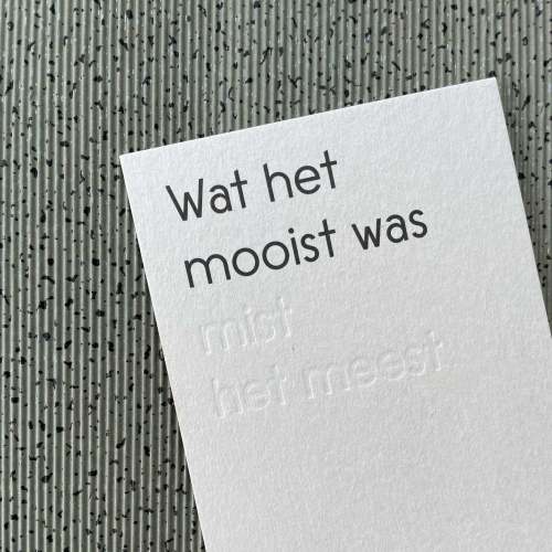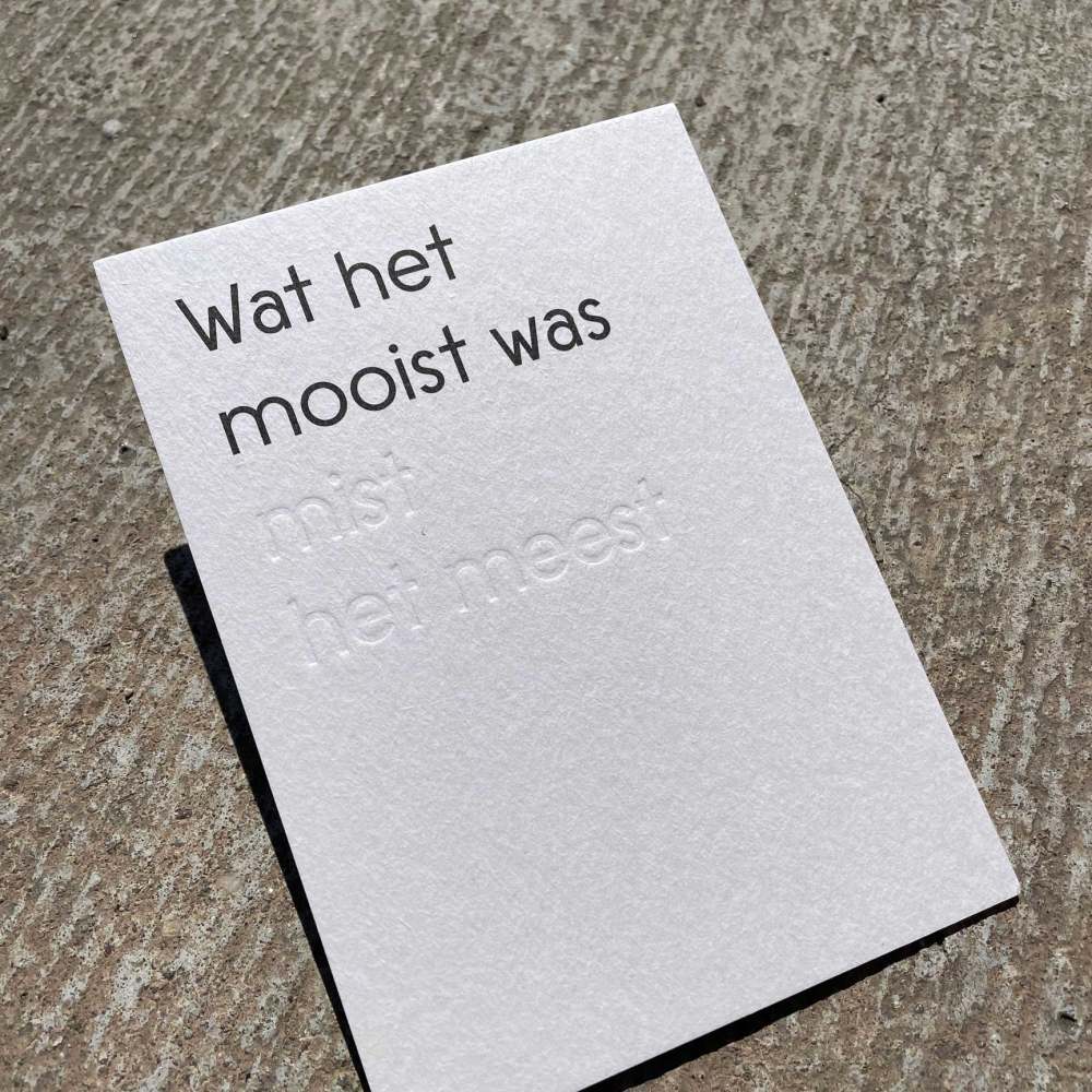 Gedrukt op stevig 480 gram houtpulpkarton, 'mist het meest' staat in diepdruk (geen inkt).