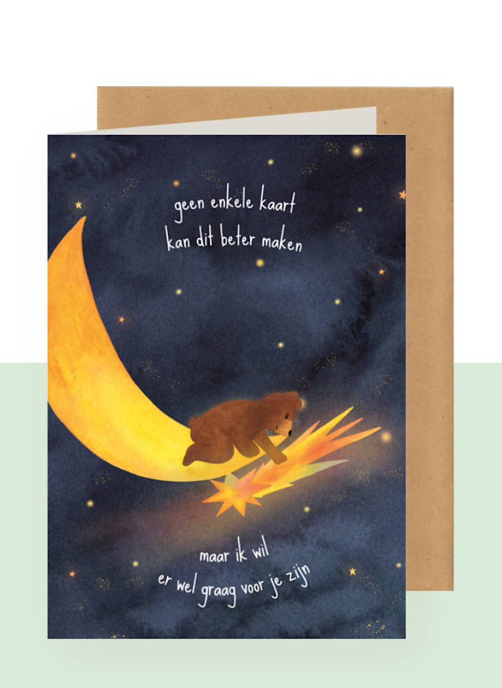 Deze troostkaart spreekt uit wat zovelen voelen in tijden van verdriet, ziekte of verlies. Ze erkent het onvermogen en tegelijk de kracht van eenvoudige nabijheid.