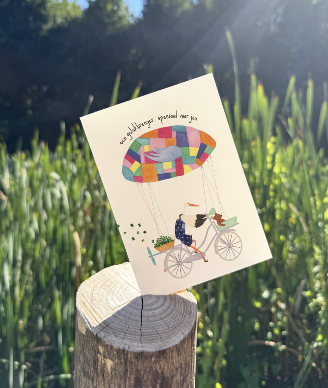 De kaart “Een gelukbrenger, speciaal voor jou” strooit een handvol klavertjes-vier over papier. Kleine symbolen van hoop, vertrouwen en warmte.