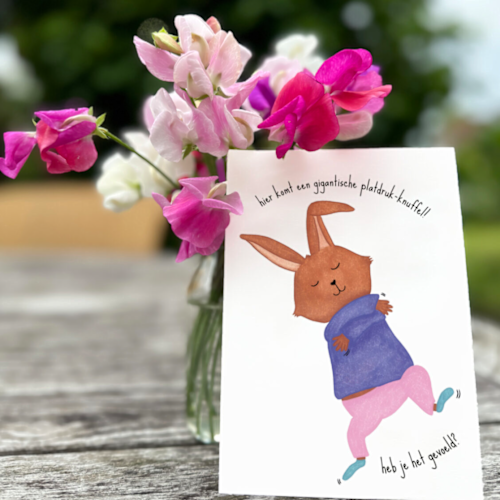 Op de blanco achterzijde van de kaart vind je een kleine illustratie terug met een knipoog naar de voorzijde.