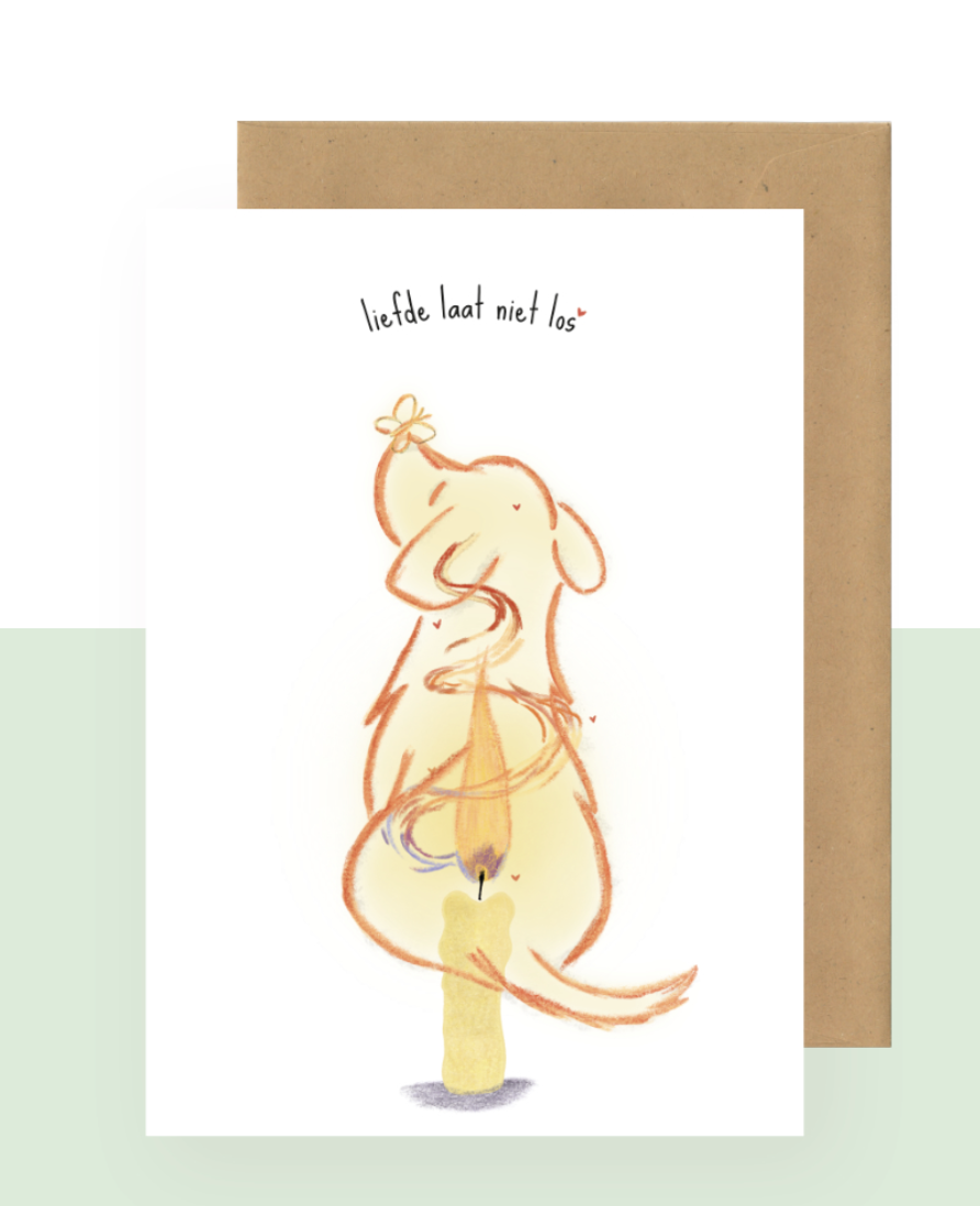 Geen tikkende poten die volgen op elke stap, geen enthousiaste begroeting aan de deur, geen blik die alles begrijpt zonder woorden.Deze troostkaart “Liefde laat niet los” werd gemaakt voor dat trouwe gezelschap dat plots ontbreekt.