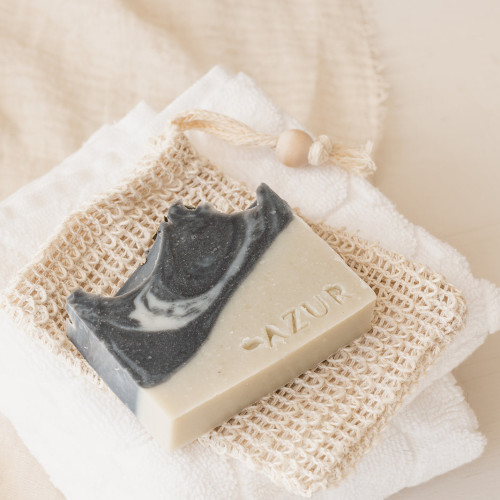 Ingrediënten: Verzeepte olijfolie, verzeepte kokosolie, verzeepte cacaoboter, verzeepte zoete amandelolie, water, glycerine, verzeepte shea butter, verzeepte castor olie, pijnboom etherische olie, cederhout etherische olie, charcoal, groene klei, eucalyptus bladeren gedroogd, maanzaad