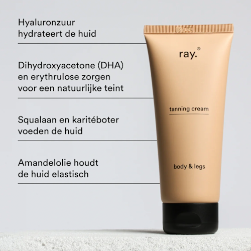 Nieuw in het gamma van Ray! Lichte, zelfbruinende crème voor benen en lichaam die reeds na enkele uren een natuurlijke, sun-kissed look geeft. Zonder oranje ondertonen, storende geur of vlekken op kleding. De kleur ontwikkelt zich geleidelijk en wordt intenser na meerdere dagen gebruik.
